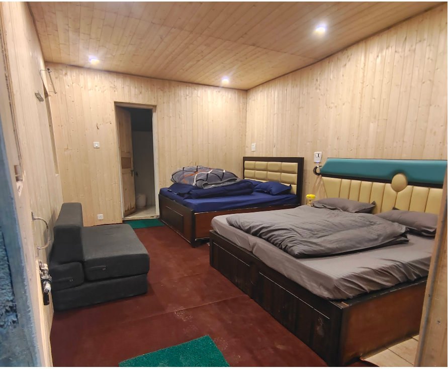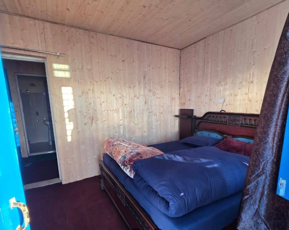 A. Rooms have traditional wooden ceilings that help retain warmth. Extra blankets are usually provided, but there is no central heating or room heaters (common in high-altitude budget properties).