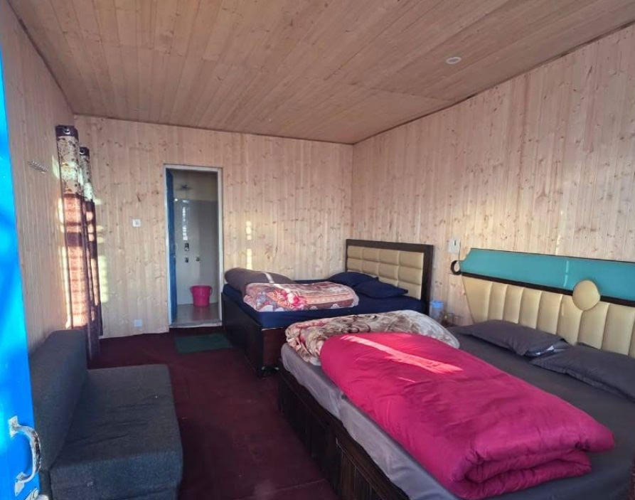 A. The hotel offers clean and comfortable Double Bedded Rooms (ideal for couples) and Four Bedded Rooms (suitable for families and groups). Rooms feature wooden interiors and scenic views of meadows and valleys.